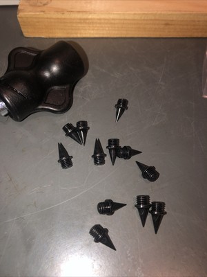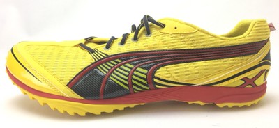 | This is a used pair of Mens US Size 8 Puma'Complete' track& field cleats. They were used for several seasons. So they are well-worn, but do have some life left in them. There are no rips or tears anywhere, but they are soiled on both the uppers and soles. The right shoe is also missing one cleat. I will include the bag and cleat tool shown in the last photo- note this is a Nike'Mercurial' bag. So it doesn't strictly match the shoes, and there is marker on it to hide the original owner's contact info. |
