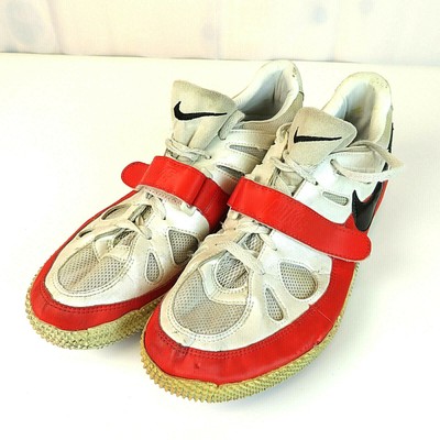| This sale is for a pair of Nike Zoom HJ(high jump) Red& White Track& Field Cleats Shoes Men's Size 11.5. These were worn at 1 track meet. That's why the dark spots on the outsoles. There may be some minor staining on the uppers, see photos. See shoes, although not brand new are like new from a performance point of view. The box is a bit on the tired side. Just showing it to show that these were still new enough that the box was still around. Will be shipped in a secure box. Includes additional spikes that may be mounted. And a Nike Track& Field bag. |
